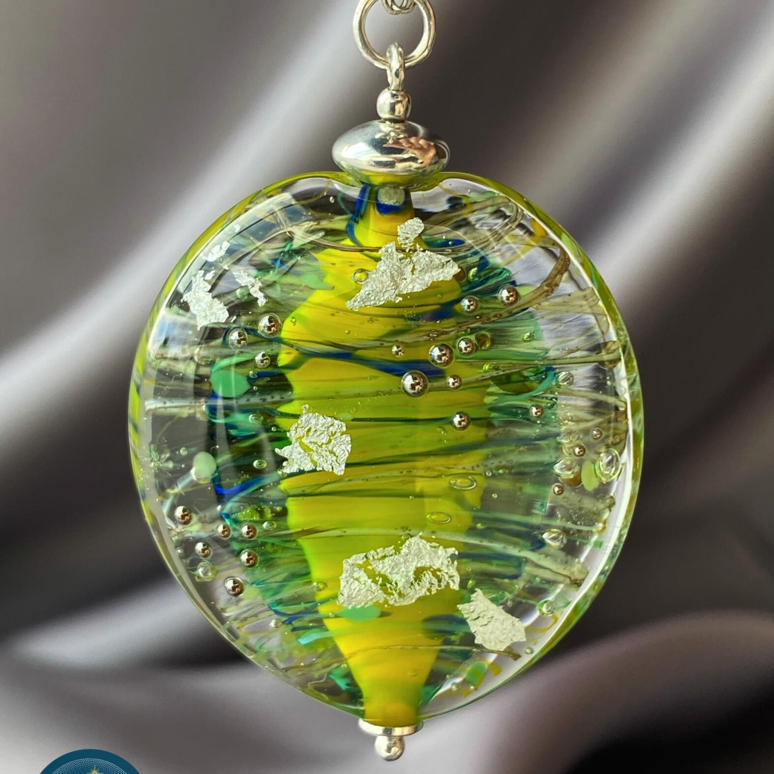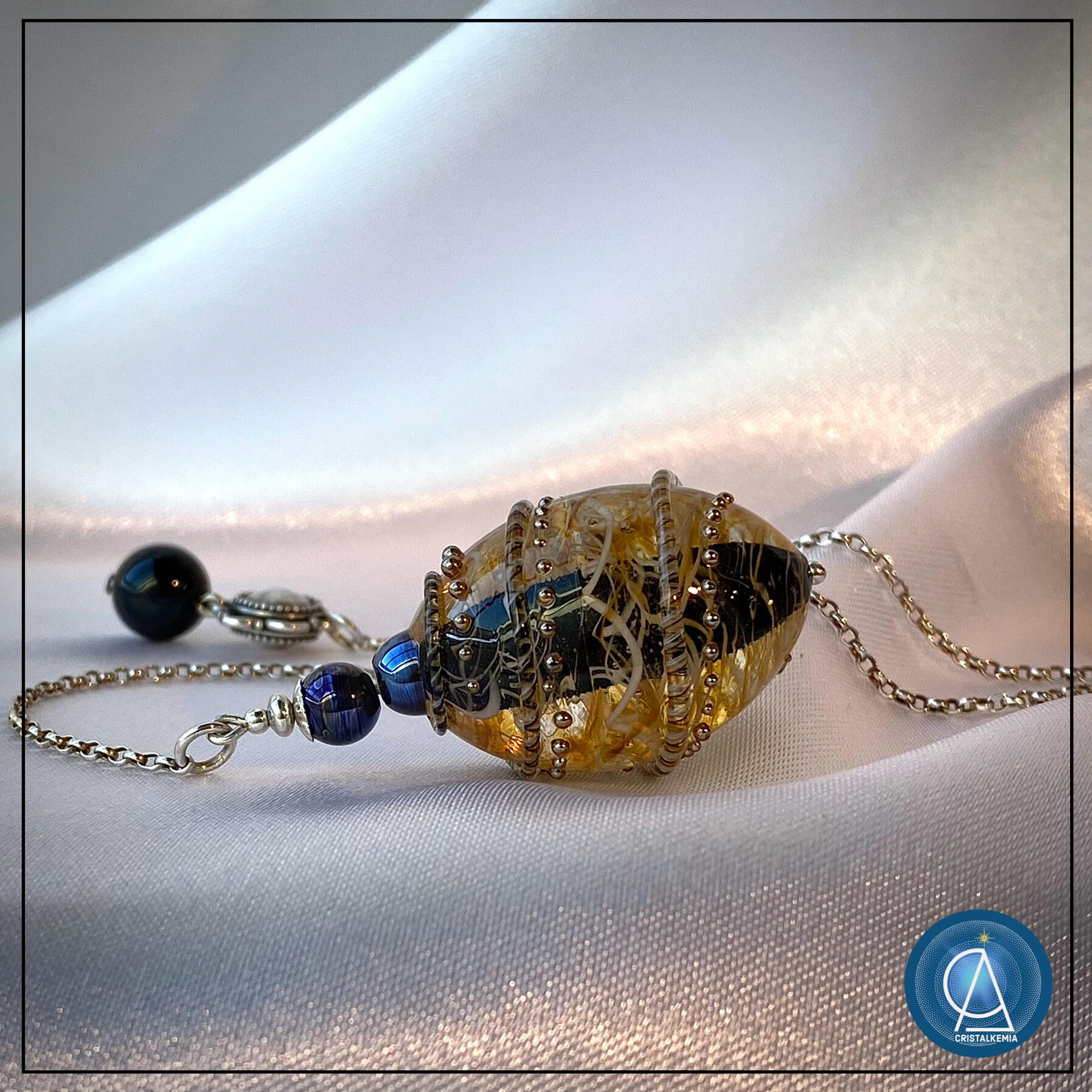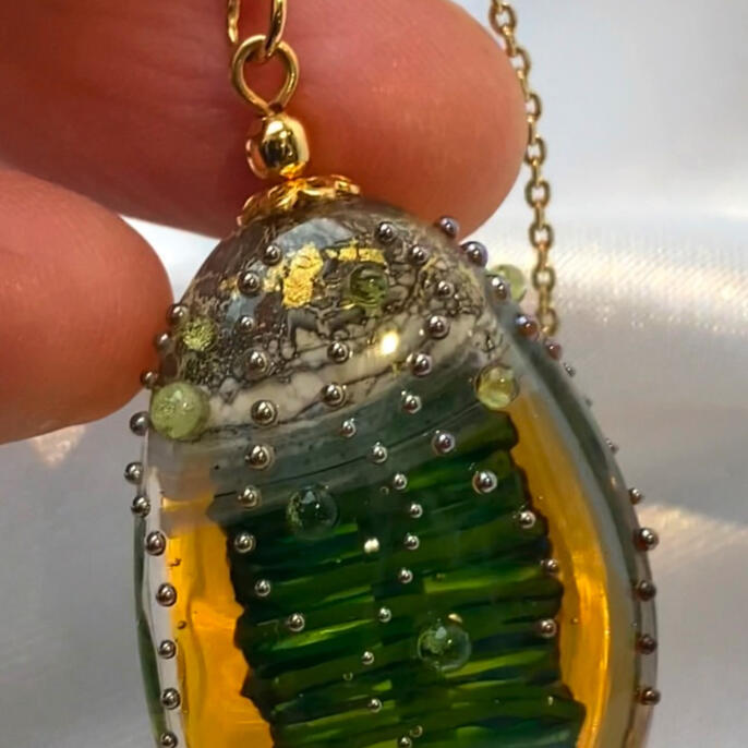 "Le pendentif "Résonance" porte tellement bien son Nom. Dès que je l'ai vu, il m'a appelé! Il résonne encore plus auprès de moi. Merci pour ce travail merveilleux, somptueux."2/09/22