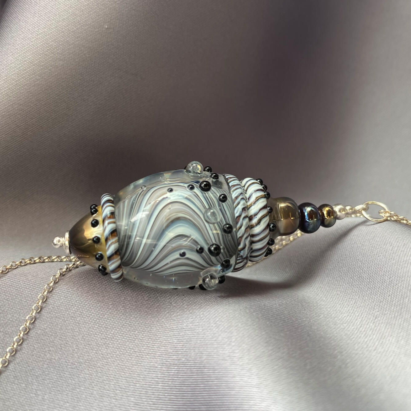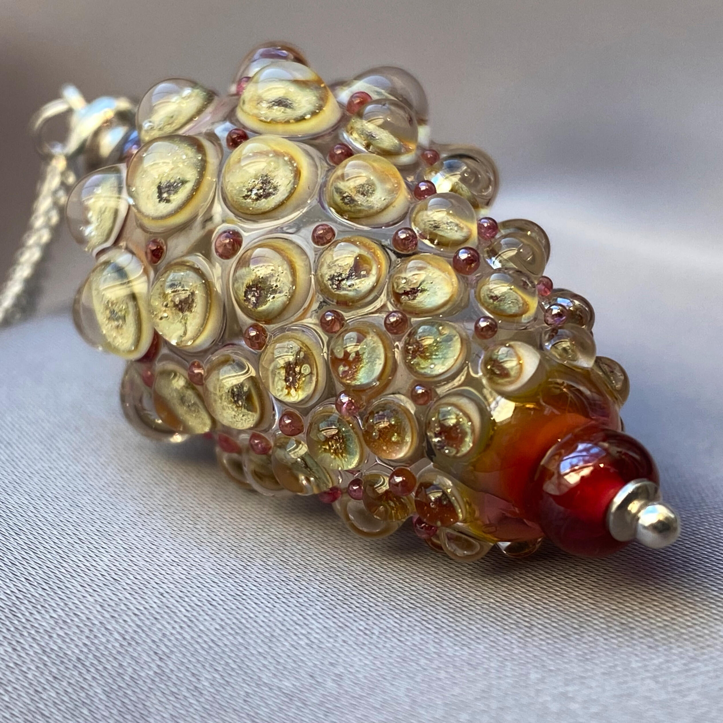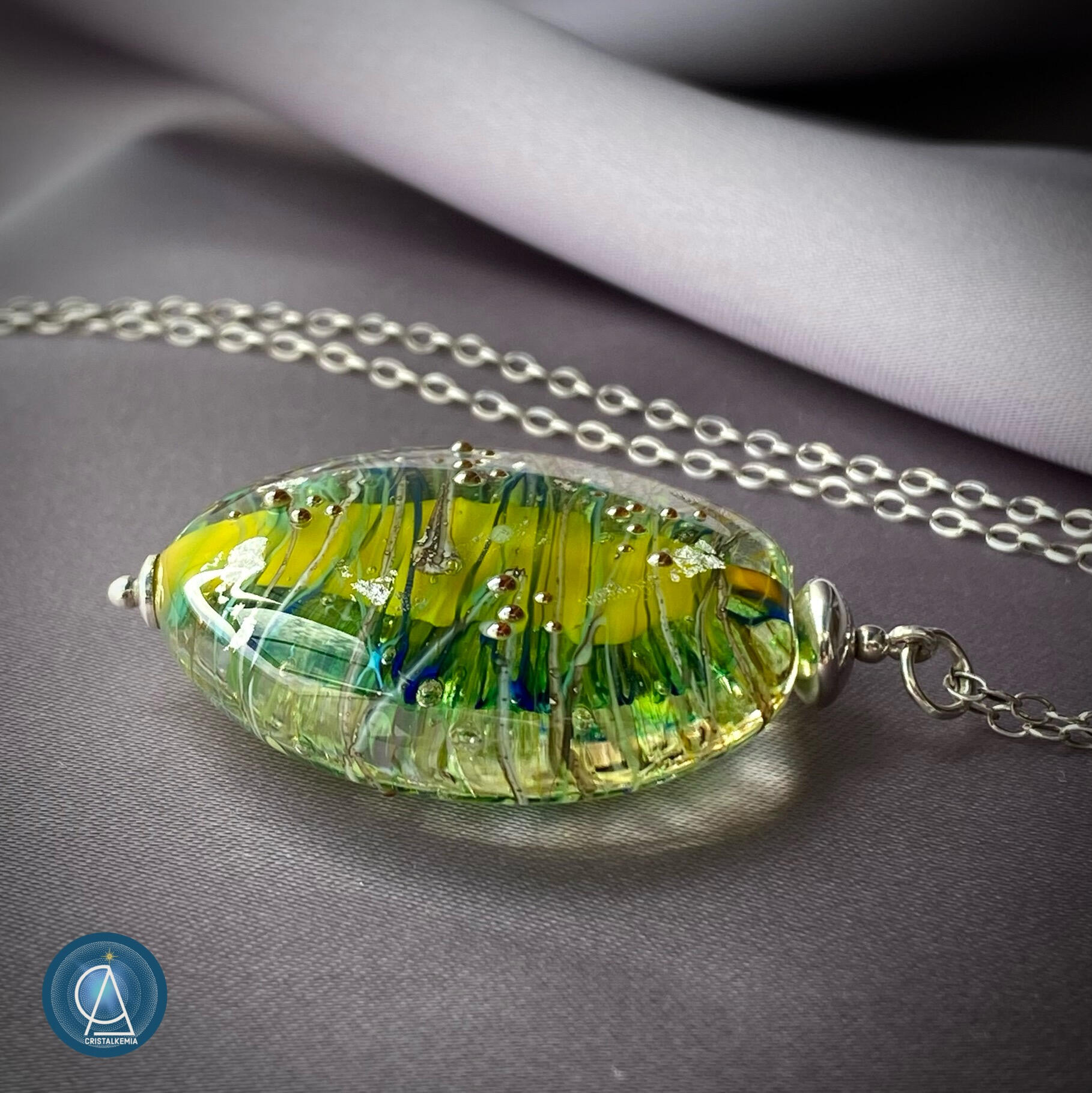Prendre soin de ma création lui garantira une longévité optimum. Le matériau verre peut traverser les siècles, si celui-ci évidemment ne subit pas de casse ou de corrosion excessive.La plupart de mes créations sont pleines et massives, ce qui leur confère une solidité certaine. Quand aux pièces soufflées (les bulles de verre), elles seront plus fragiles et demandent d’éviter tout choc sur une surface dure.Concernant les parties métalliques (chaines et apprêts de bijouterie) :