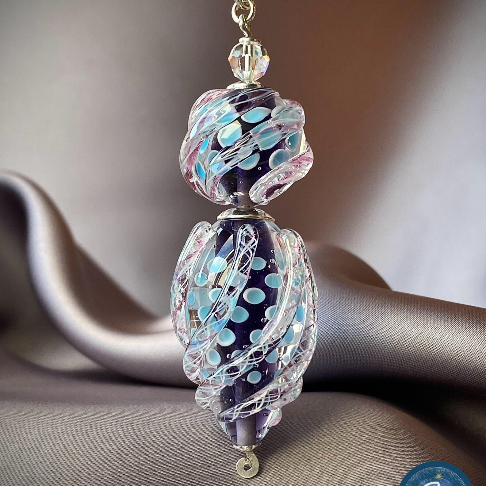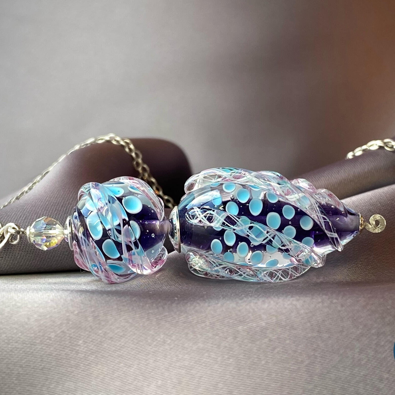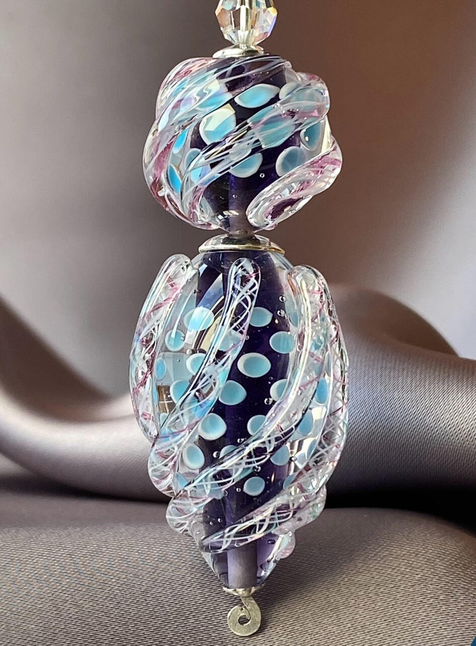 Cette pièce aux teintes douces de bleu-violet est composée de deux perles de verre filé s'accordant dans un mouvement spiralé ascensionnel.