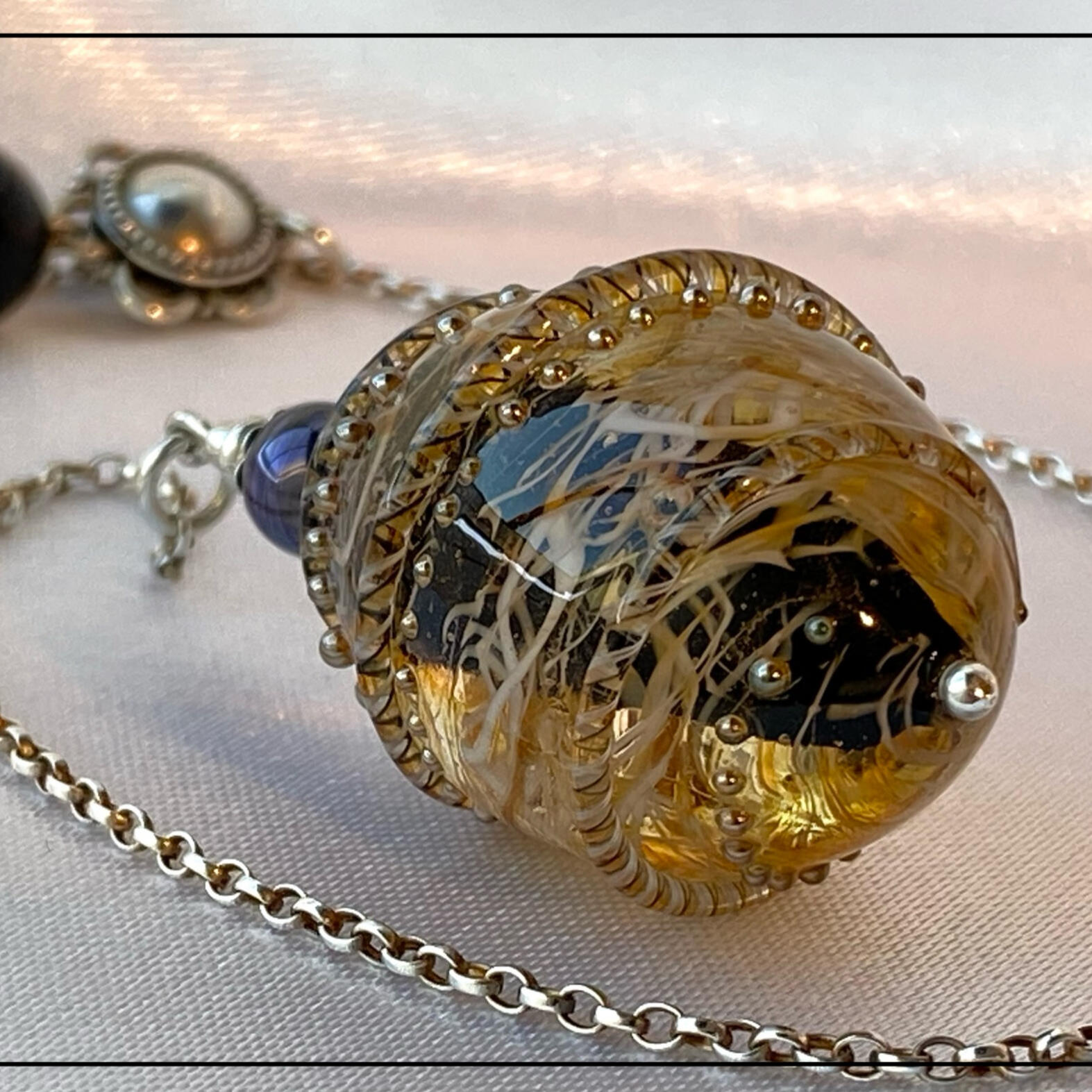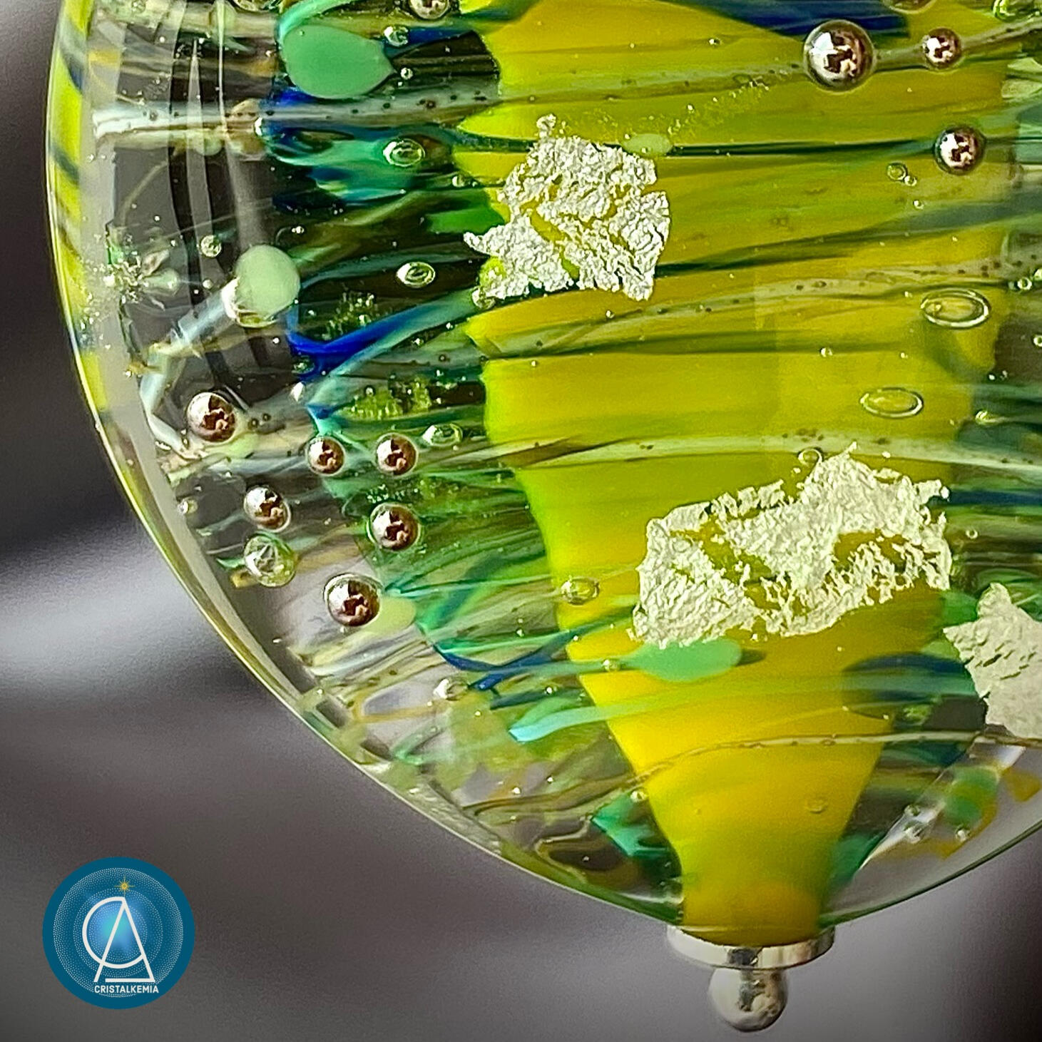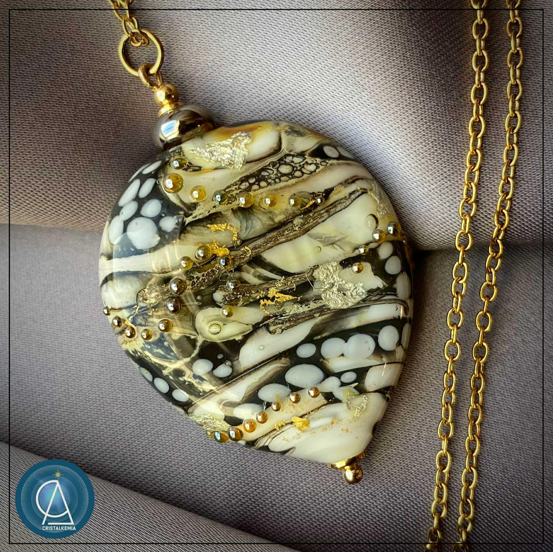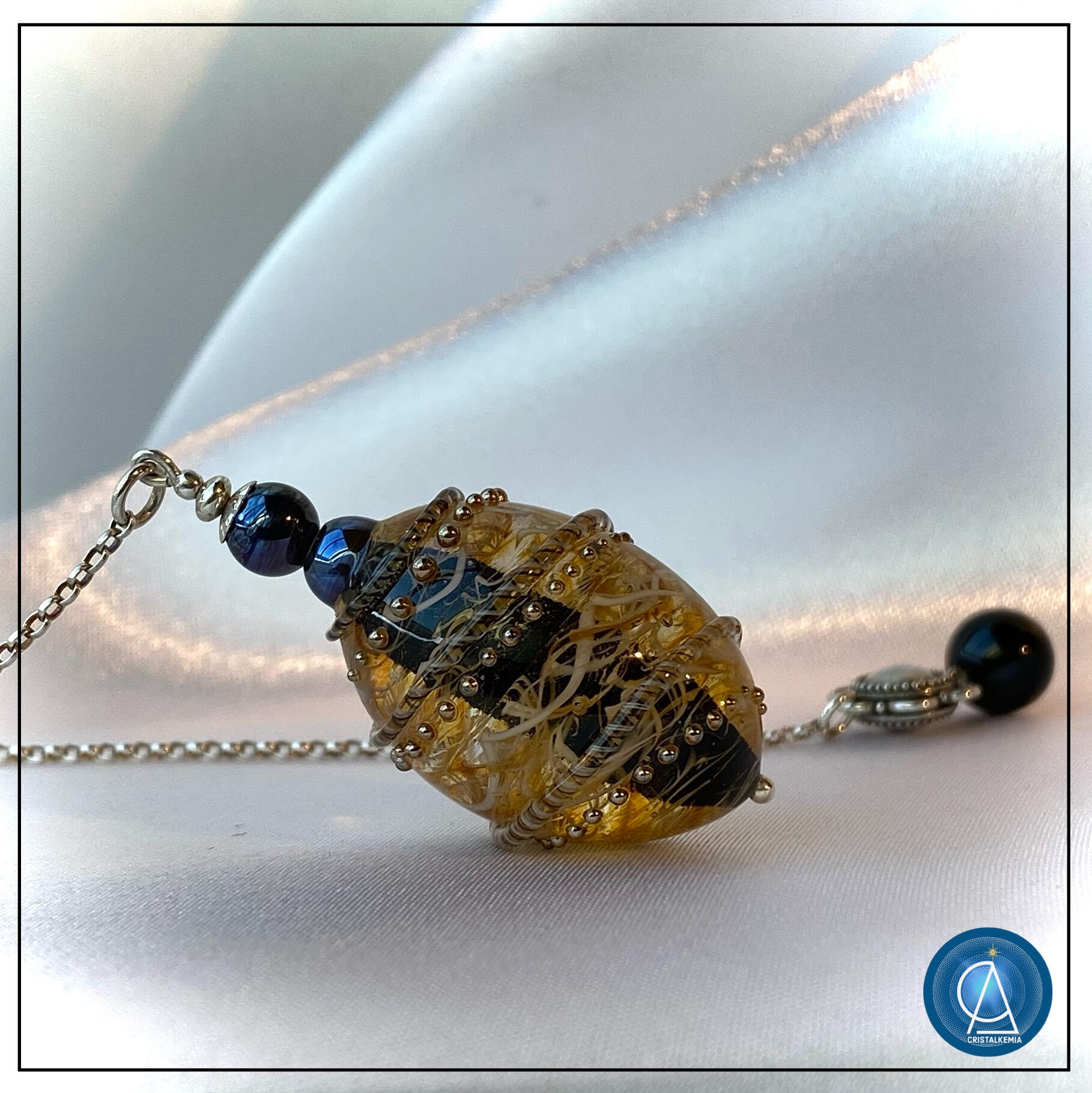 Prendre soin de ma création lui garantira une longévité optimum. Le matériau verre peut traverser les siècles, si celui-ci évidemment ne subit pas de casse ou de corrosion excessive.La plupart de mes créations sont pleines et massives, ce qui leur confère une solidité certaine. Quand aux pièces soufflées (les bulles de verre), elles seront plus fragiles et demandent d’éviter tout choc contre une surface dure.Concernant les parties métalliques (chaines et apprêts de bijouterie) :