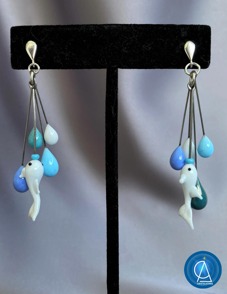"Boucles d'oreilles poissons dans l'eau" : un assemblage de cinq perles de verres opaques, en nuances douces aquatiques et lumineuses.